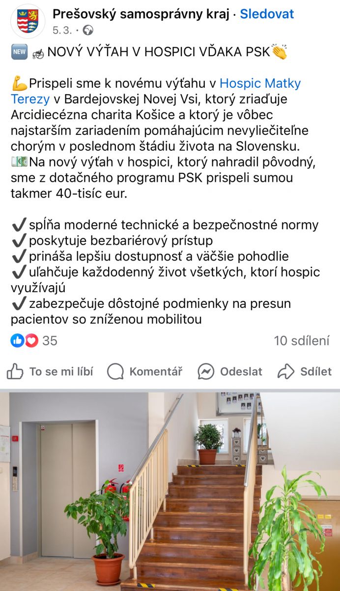 The benefits of the new lift were also recognized by the Prešov Region on their official Facebook page (link with video HERE). They highlighted the modern technical and safety standards, barrier-free access, and dignified conditions for transporting patients.